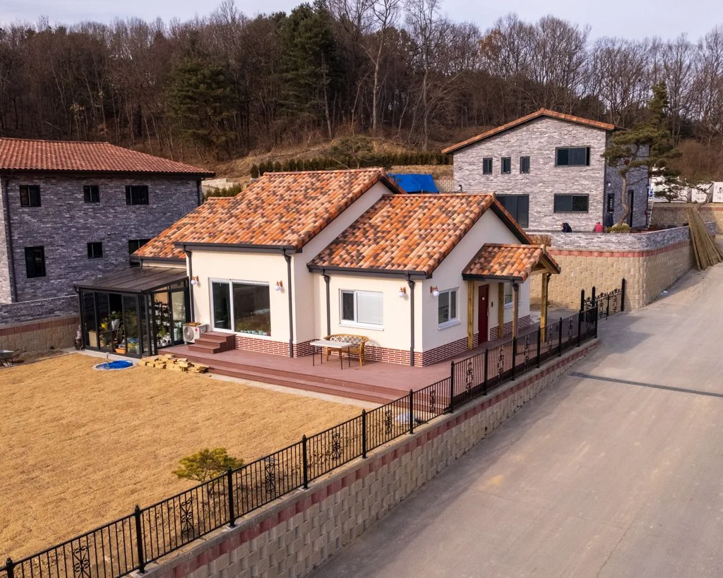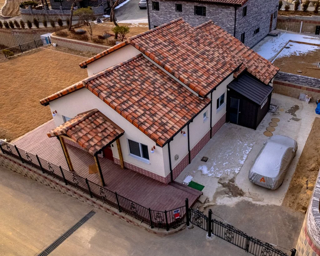 외벽 파랙스 스타코, 지붕 테릴 점토기와, 내부 합지벽지 마감